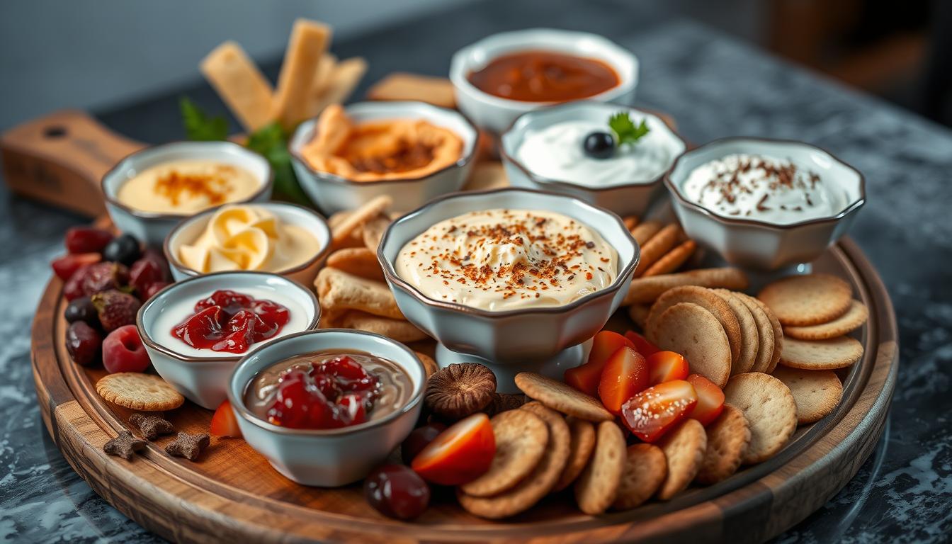 For a heartier snack, try cheese dips with crackers or chips. Tortilla chips are a favorite, with 45% of dips paired with them14. The goal is to match flavors and textures well.