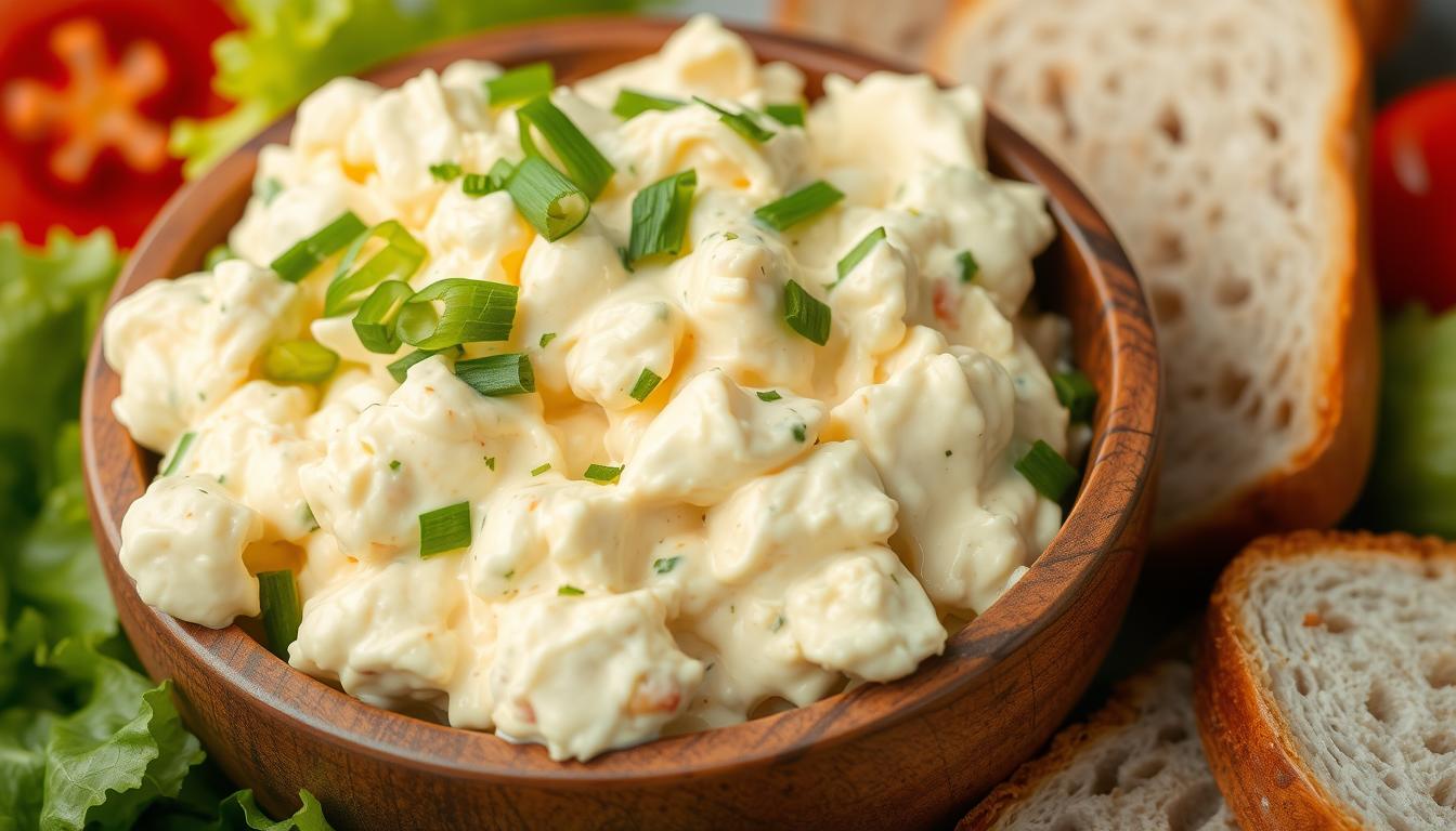 To make a Delicious Egg Salad for Sandwiches, you need the right ingredients. Eggs, mayonnaise, mustard, and green onions are key. The third web source says to mash yolks with mayonnaise until smooth, then mix in the whites4. This makes the salad creamy and smooth, ideal for lunch.
